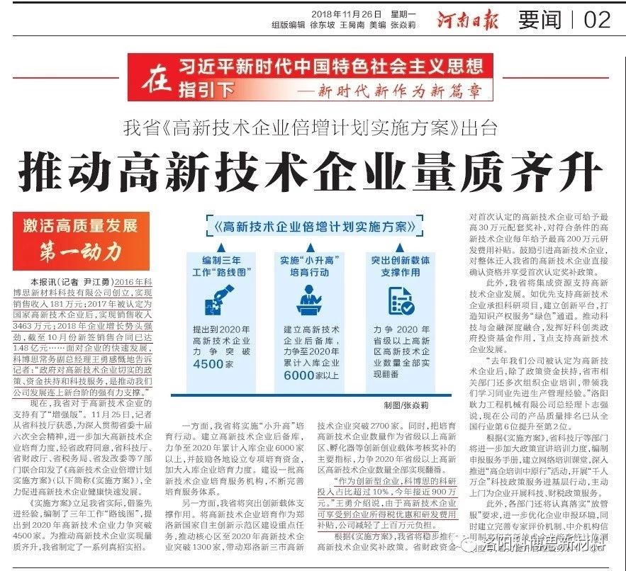 官宣:推動高新技術企業量質齊升——洛陽科博思新材料科技有限公司接受《河南日報》專訪