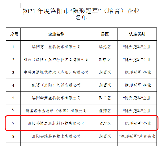 近日,洛陽市工業和信息化局印發了《關于公布2021年度洛陽市“隱形冠軍”(培育)企業名單的通知》(【2021】84號),洛陽科博思新材料科技有限公司榮獲“隱形冠軍”企業稱號。